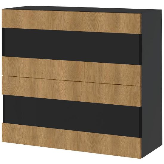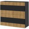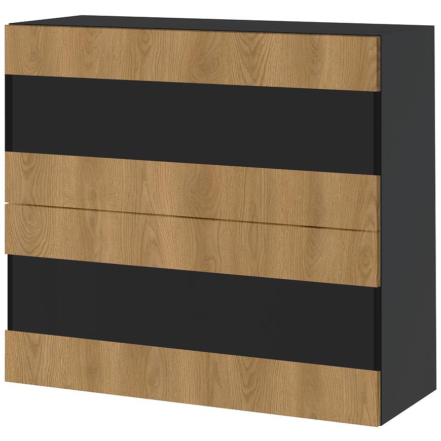 Dąb karmelowy, użyty do produkcji frontów, nadaje szafce niepowtarzalny charakter. To elegancki kolor, który doskonale współgra z wieloma aranżacjami wnętrz, dodając im ciepła i przytulności. Czarny korpus w matowym wykończeniu to idealne tło dla frontów, tworząc kontrastowy efekt i dodając nowoczesności.