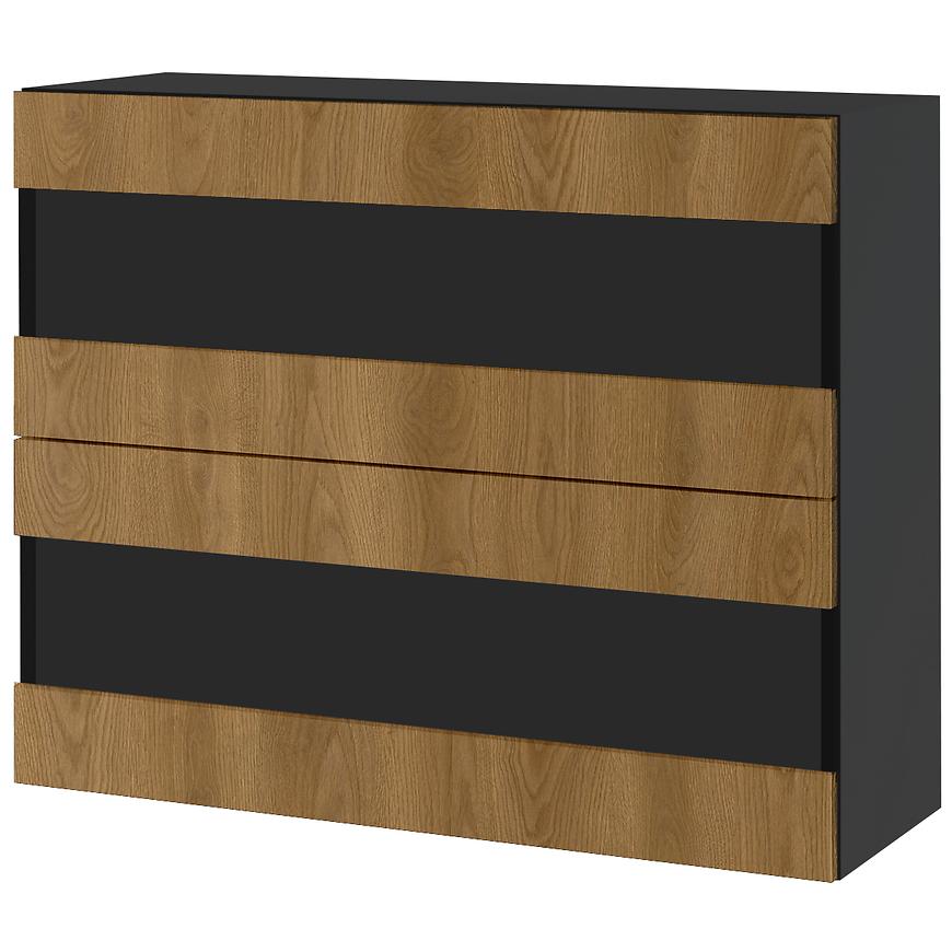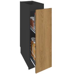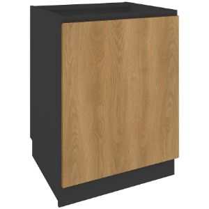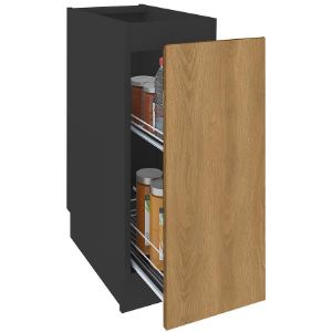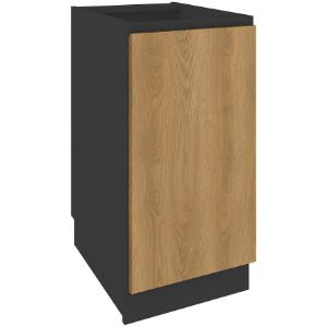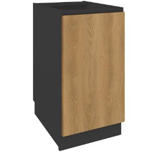 Dąb karmelowy, użyty do produkcji frontów, nadaje szafce niepowtarzalny charakter. To elegancki kolor, który doskonale współgra z wieloma aranżacjami wnętrz, dodając im ciepła i przytulności. Czarny korpus w matowym wykończeniu to idealne tło dla frontów, tworząc kontrastowy efekt i dodając nowoczesności.