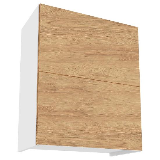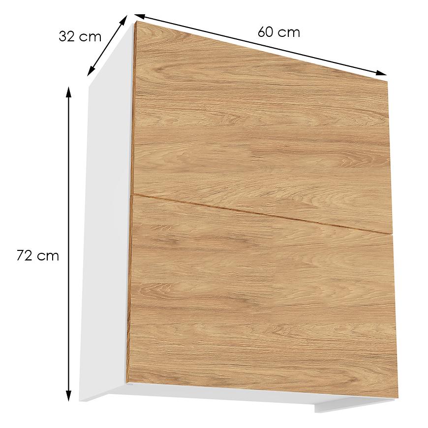 Elegancka szafka kuchenna wisząca z kolekcji Campari zachwyca swoim wyglądem i funkcjonalnością. Jej fronty w kolorze hikory prezentują się niezwykle stylowo, nadając kuchni wyjątkowego charakteru. Kontrastują one pięknie z białym kolorem korpusu, co dodaje pomieszczeniu lekkości i nowoczesnego wyrazu.