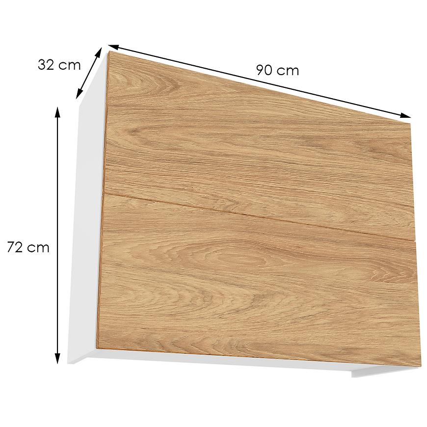 Elegancka szafka kuchenna wisząca z kolekcji Campari zachwyca swoim wyglądem i funkcjonalnością. Jej fronty w kolorze hikory prezentują się niezwykle stylowo, nadając kuchni wyjątkowego charakteru. Kontrastują one pięknie z białym kolorem korpusu, co dodaje pomieszczeniu lekkości i nowoczesnego wyrazu.