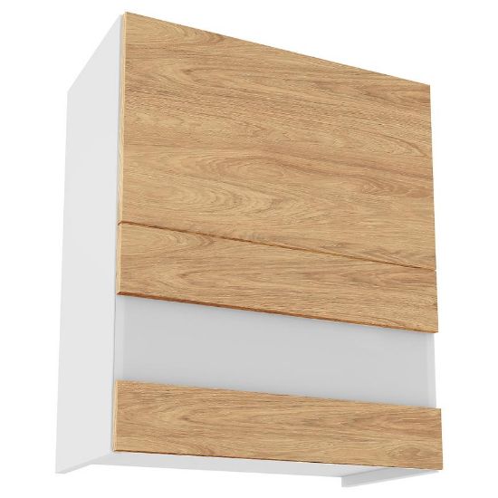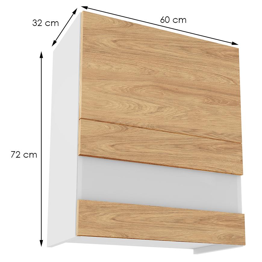 Elegancka szafka kuchenna wisząca z kolekcji Campari zachwyca swoim wyglądem i funkcjonalnością. Jej fronty w kolorze hikory prezentują się niezwykle stylowo, nadając kuchni wyjątkowego charakteru. Kontrastują one pięknie z białym kolorem korpusu, co dodaje pomieszczeniu lekkości i nowoczesnego wyrazu.
