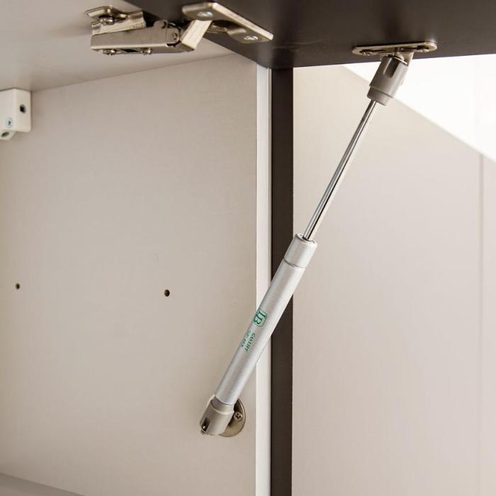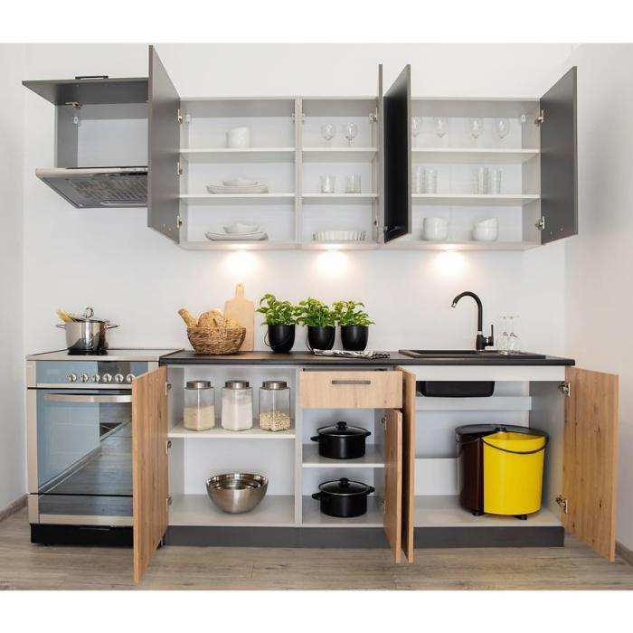 Konstrukcja korpusu oraz frontów mebli została wykonana z płyty wiórowej laminowanej. Fronty szafek są w kolorze dąb artisan, natomiast korpus jest w kolorze szarym.