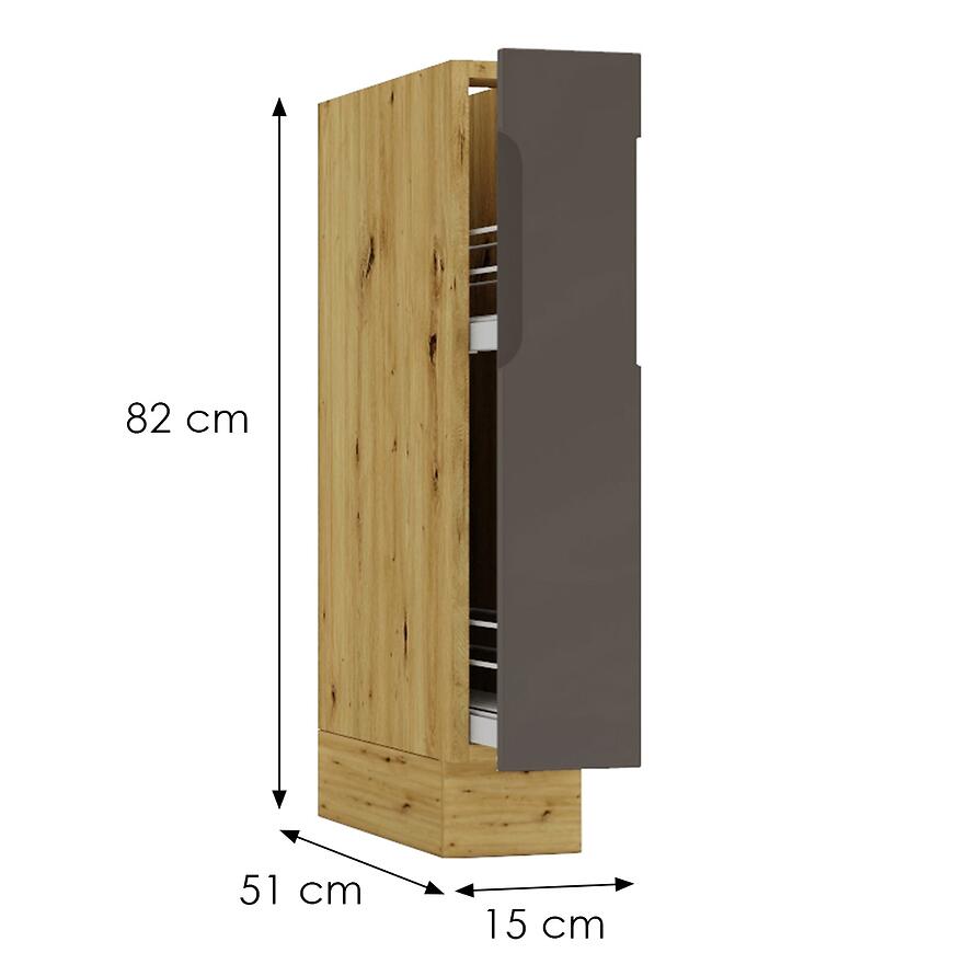 Szafka Cosmo Isabel D15 Cargo + Kosz to doskonałe uzupełnienie nowoczesnej zabudowy kuchennej. Dzięki swojej wąskiej formie i praktycznemu systemowi wysuwanemu typu cargo, pozwala na maksymalne wykorzystanie przestrzeni w kuchni, nawet w trudno dostępnych miejscach.