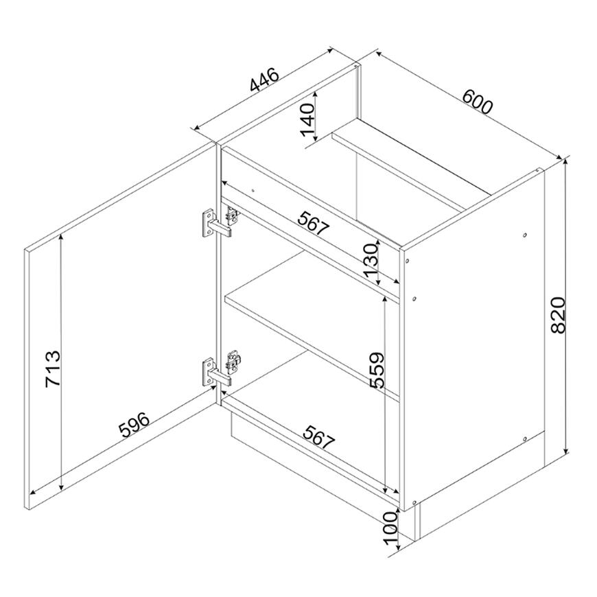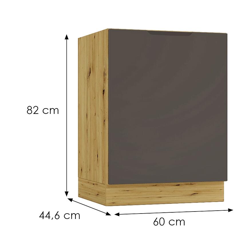 Model D60pc to klasyczna szafka dolna z jednymi drzwiczkami i przestrzenią wewnętrzną do przechowywania garnków, naczyń lub produktów spożywczych.