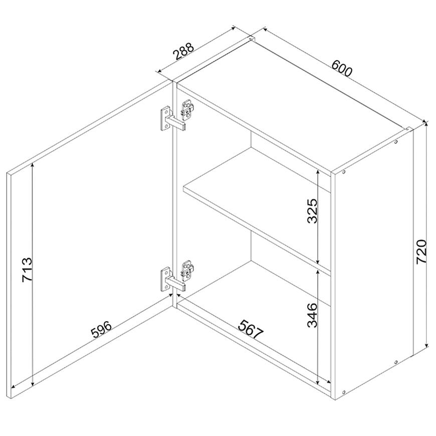 Szafka W60 P/L (z możliwością montażu drzwi na prawą lub lewą stronę) doskonale sprawdzi się jako część zabudowy górnej kuchni, oferując praktyczną przestrzeń do przechowywania naczyń, przypraw czy szklanek.