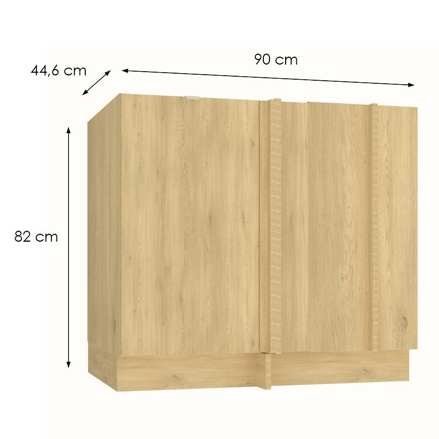 Szafka Dnp P/L o wymiarach 82 × 90 × 44,6 cm zapewnia dużą przestrzeń do przechowywania garnków, naczyń, akcesoriów kuchennych i artykułów spożywczych. Jej szerokość 90 cm sprawia, że jest idealna do centralnych fragmentów zabudowy dolnej, oferując wygodny dostęp do wszystkich przechowywanych przedmiotów.