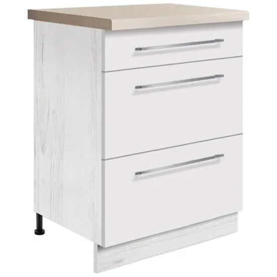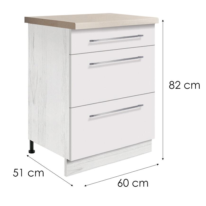 Fronty wykonane z laminowanej płyty wiórowej wykończone na wysoki połysk odbijają światło, optycznie powiększając przestrzeń. Korpus w matowym wykończeniu zapewnia trwałość i odporność na codzienne użytkowanie. Szafka należy do kategorii szafek kuchennych dolnych, dzięki czemu stanowi solidną bazę pod zabudowę kuchenną.