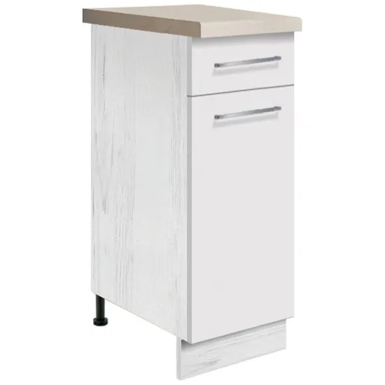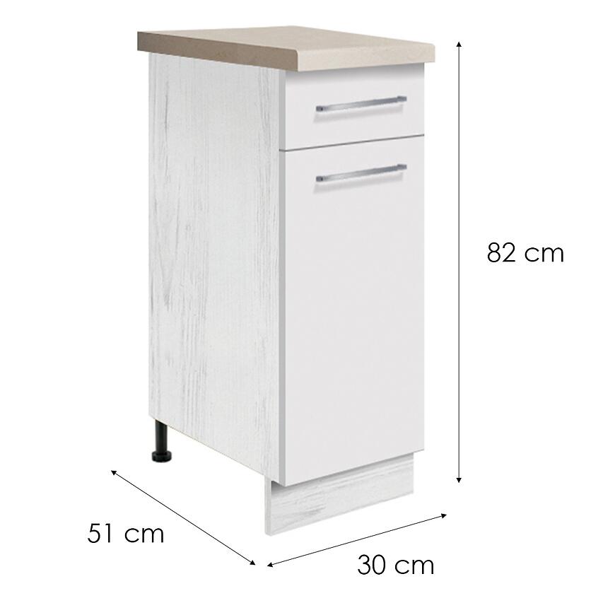 Fronty wykonane z laminowanej płyty wiórowej wykończone na wysoki połysk odbijają światło, optycznie powiększając przestrzeń. Korpus w matowym wykończeniu zapewnia trwałość i odporność na codzienne użytkowanie. Szafka należy do kategorii szafek kuchennych dolnych, dzięki czemu stanowi solidną bazę pod zabudowę kuchenną.