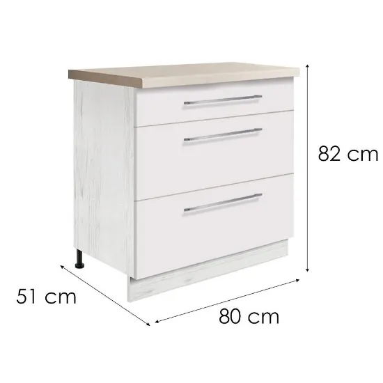 Fronty wykonane z laminowanej płyty wiórowej wykończone na wysoki połysk odbijają światło, optycznie powiększając przestrzeń. Korpus w matowym wykończeniu zapewnia trwałość i odporność na codzienne użytkowanie. Szafka należy do kategorii szafek kuchennych dolnych, dzięki czemu stanowi solidną bazę pod zabudowę kuchenną.