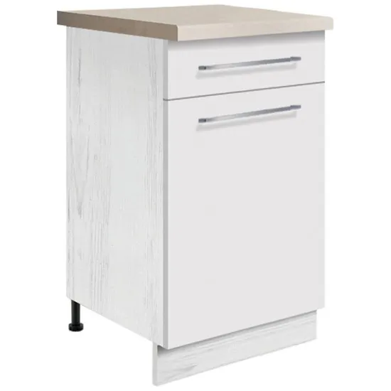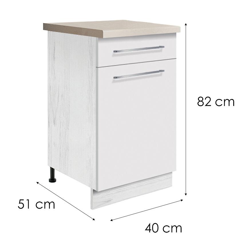 Fronty wykonane z laminowanej płyty wiórowej wykończone na wysoki połysk odbijają światło, optycznie powiększając przestrzeń. Korpus w matowym wykończeniu zapewnia trwałość i odporność na codzienne użytkowanie. Szafka należy do kategorii szafek kuchennych dolnych, dzięki czemu stanowi solidną bazę pod zabudowę kuchenną.