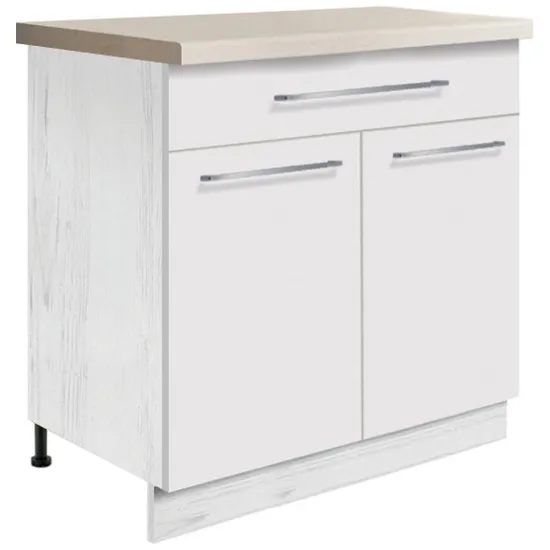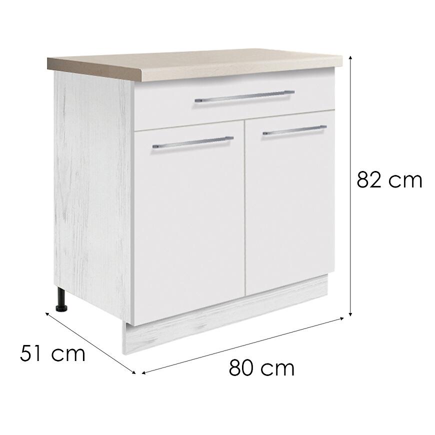 Fronty wykonane z laminowanej płyty wiórowej wykończone na wysoki połysk odbijają światło, optycznie powiększając przestrzeń. Korpus w matowym wykończeniu zapewnia trwałość i odporność na codzienne użytkowanie. Szafka należy do kategorii szafek kuchennych dolnych, dzięki czemu stanowi solidną bazę pod zabudowę kuchenną.
