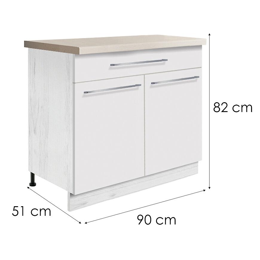 Fronty wykonane z laminowanej płyty wiórowej wykończone na wysoki połysk odbijają światło, optycznie powiększając przestrzeń. Korpus w matowym wykończeniu zapewnia trwałość i odporność na codzienne użytkowanie. Szafka należy do kategorii szafek kuchennych dolnych, dzięki czemu stanowi solidną bazę pod zabudowę kuchenną.
