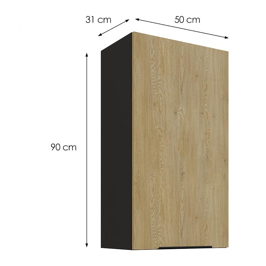 Fronty w kolorze dąb cremona o matowym wykończeniu prezentują się lekko i naturalnie, dzięki czemu optycznie ocieplają przestrzeń kuchenną. Jasne, drewnopodobne wybarwienie górnych frontów świetnie komponuje się z czarnym, matowym korpusem, tworząc kontrastowy i nowoczesny efekt. Zarówno fronty, jak i korpus wykonane są z laminowanej płyty wiórowej, co zapewnia odporność na codzienne użytkowanie oraz łatwość w utrzymaniu czystości.