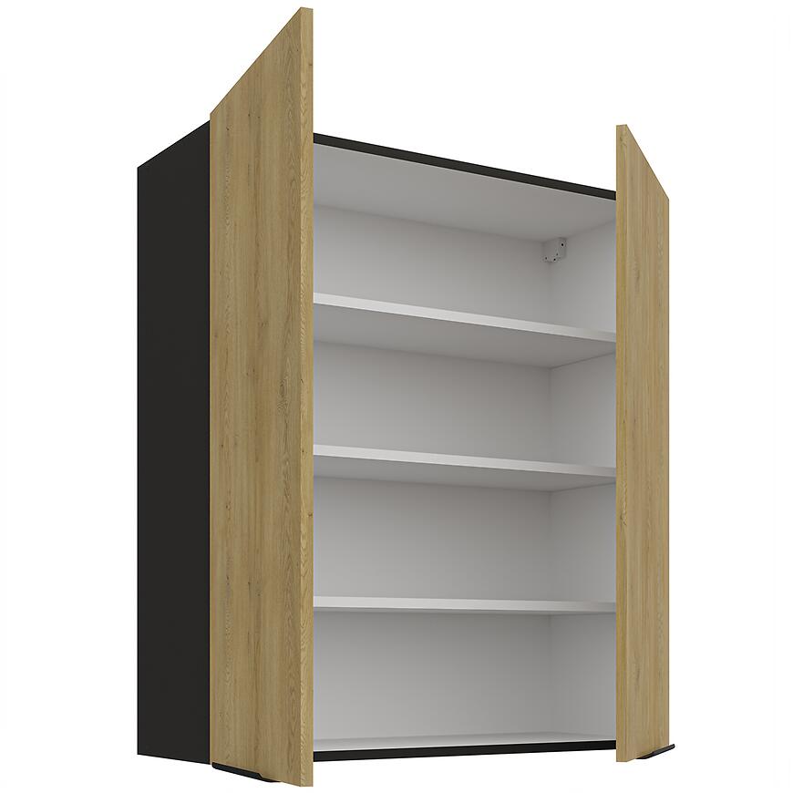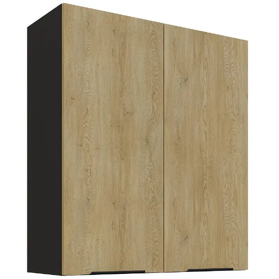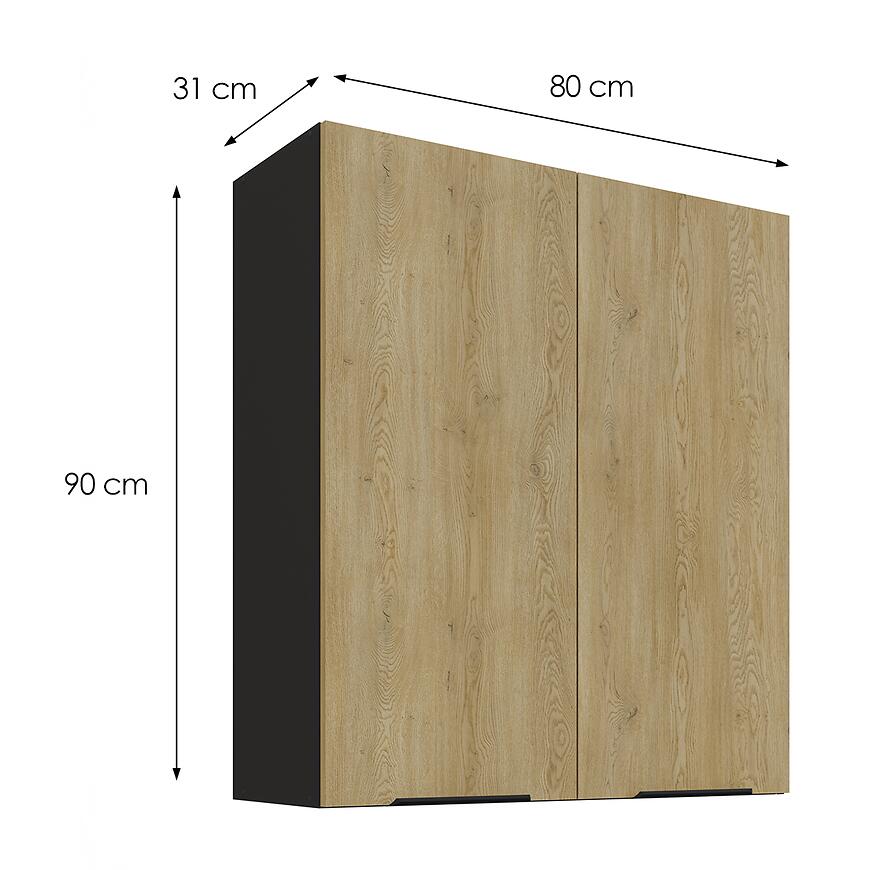 Fronty w kolorze dąb cremona o matowym wykończeniu prezentują się lekko i naturalnie, dzięki czemu optycznie ocieplają przestrzeń kuchenną. Jasne, drewnopodobne wybarwienie górnych frontów świetnie komponuje się z czarnym, matowym korpusem, tworząc kontrastowy i nowoczesny efekt. Zarówno fronty, jak i korpus wykonane są z laminowanej płyty wiórowej, co zapewnia odporność na codzienne użytkowanie oraz łatwość w utrzymaniu czystości.