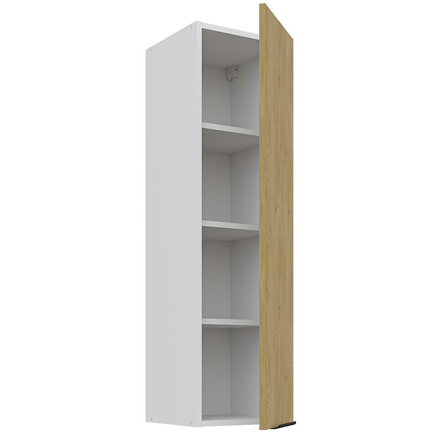 Korpus i fronty szafki zostały wykonane z trwałej płyty wiórowej laminowanej, odpornej na wilgoć, uszkodzenia mechaniczne i codzienne użytkowanie. Matowe wykończenie podkreśla subtelną strukturę drewna, nadając meblowi ponadczasowy wygląd i łatwość w utrzymaniu czystości.