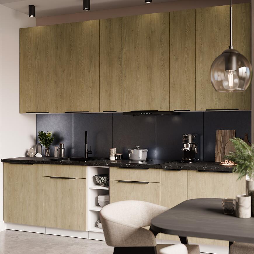 Korpus i fronty szafki zostały wykonane z trwałej płyty wiórowej laminowanej, odpornej na wilgoć, uszkodzenia mechaniczne i codzienne użytkowanie. Matowe wykończenie podkreśla subtelną strukturę drewna, nadając meblowi ponadczasowy wygląd i łatwość w utrzymaniu czystości.