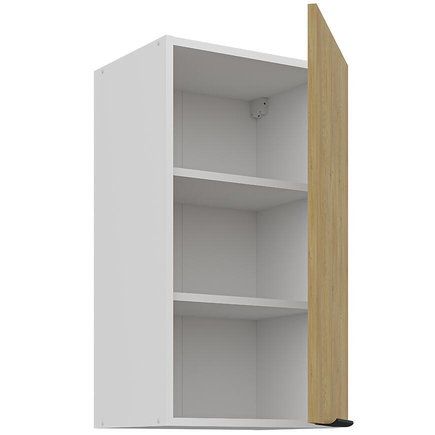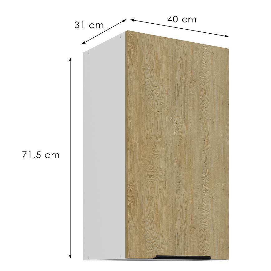 Korpus i fronty szafki zostały wykonane z trwałej płyty wiórowej laminowanej, odpornej na wilgoć, uszkodzenia mechaniczne i codzienne użytkowanie. Matowe wykończenie podkreśla subtelną strukturę drewna, nadając meblowi ponadczasowy wygląd i łatwość w utrzymaniu czystości.