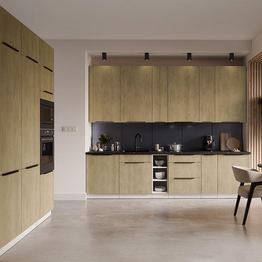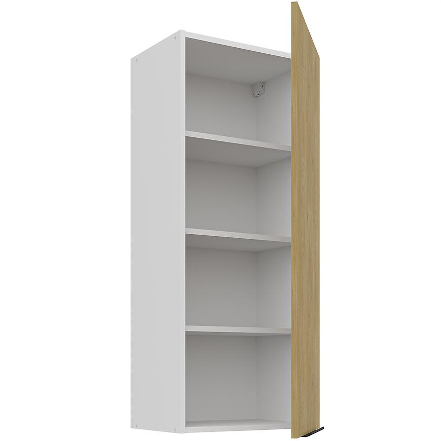 Korpus i fronty szafki zostały wykonane z trwałej płyty wiórowej laminowanej, odpornej na wilgoć, uszkodzenia mechaniczne i codzienne użytkowanie. Matowe wykończenie podkreśla subtelną strukturę drewna, nadając meblowi ponadczasowy wygląd i łatwość w utrzymaniu czystości.