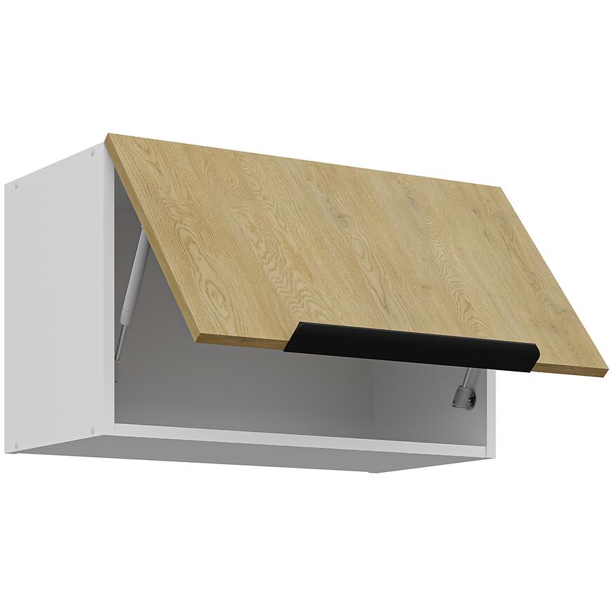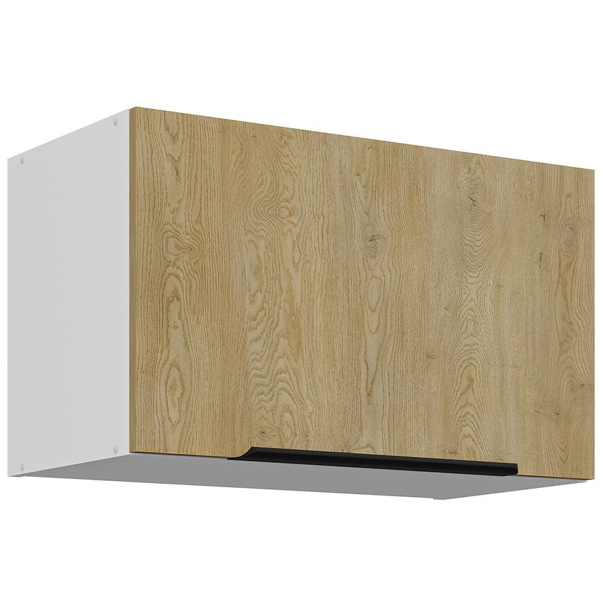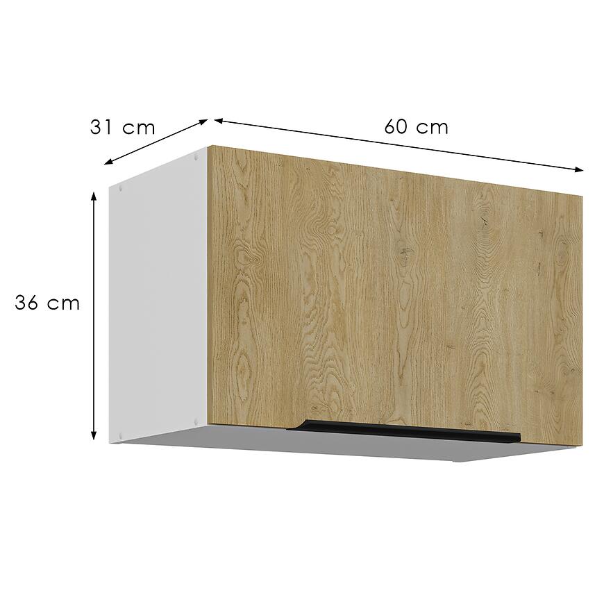 Korpus i fronty szafki zostały wykonane z trwałej płyty wiórowej laminowanej, odpornej na wilgoć, uszkodzenia mechaniczne i codzienne użytkowanie. Matowe wykończenie podkreśla subtelną strukturę drewna, nadając meblowi ponadczasowy wygląd i łatwość w utrzymaniu czystości.
