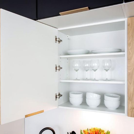Fronty kuchenne wykonane z MDF foliowany z wykończeniem matowym, a korpusy w kolorze białym z płyty wiórowej laminowanej.