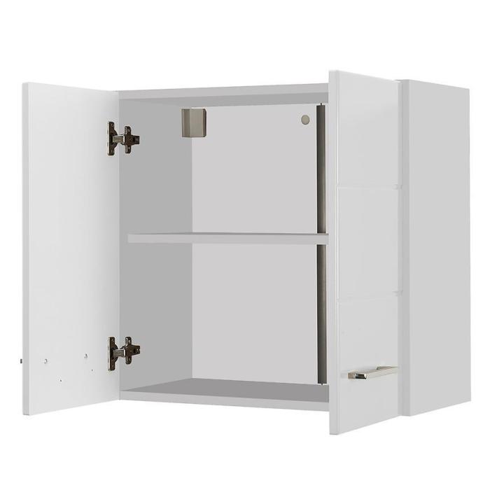 Fronty w białym połysku odbijają światło, dzięki czemu optycznie rozjaśniają przestrzeń i nadają jej świeżości. Laminowana płyta wiórowa zapewnia trwałość i odporność na codzienne użytkowanie, co przekłada się na długą żywotność mebla.
