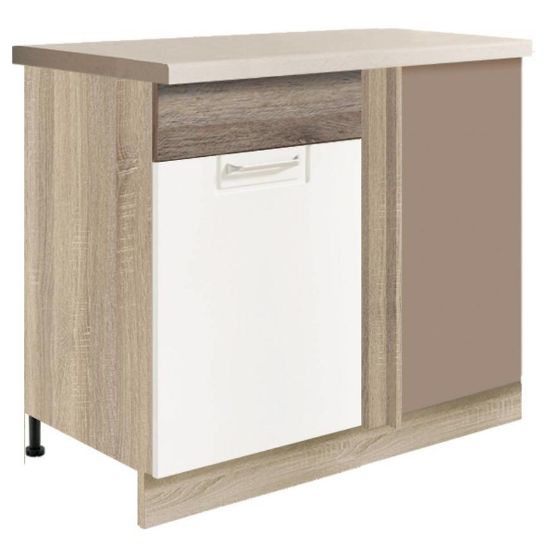 Kuchnia Econo to zestaw praktyczny i funkcjonalny. Połączenie koloru dąb sonoma, san remo i białego to ciekawe i ponadczasowe rozwiązanie. Fronty kuchenne wykonane w są z MDF foliowany. Korpus kuchni wykonany jest z płyty wiórowej laminowanej w kolorze dąb sonoma.