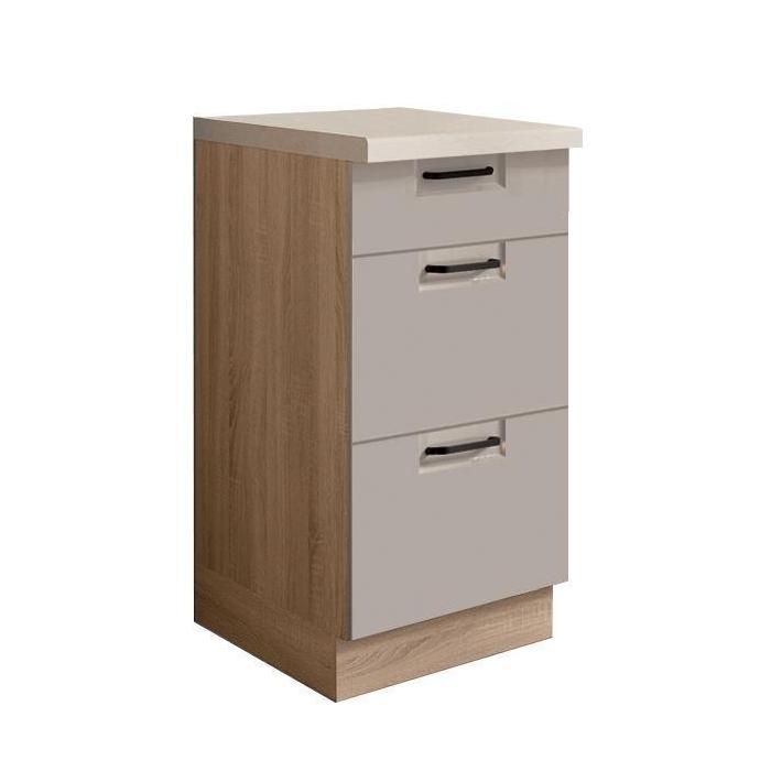 Dekor latte z elementami w kolorze dąb sonoma nadaje meblom Favorit wyjątkowego, nowoczesnego charakteru. To idealny wybór zarówno dla miłośników minimalistycznego designu, jak i dla tych, którzy cenią sobie klasykę. Fronty mebli wykończone połyskiem dodają elegancji i sprawiają, że kuchnia nabiera luksusowego charakteru, podczas gdy matowe wykończenie korpusów mebli zapewnia spójność i harmonię całego zestawu.
