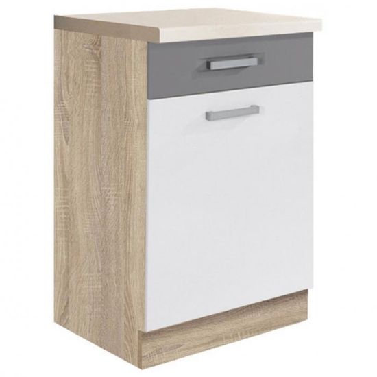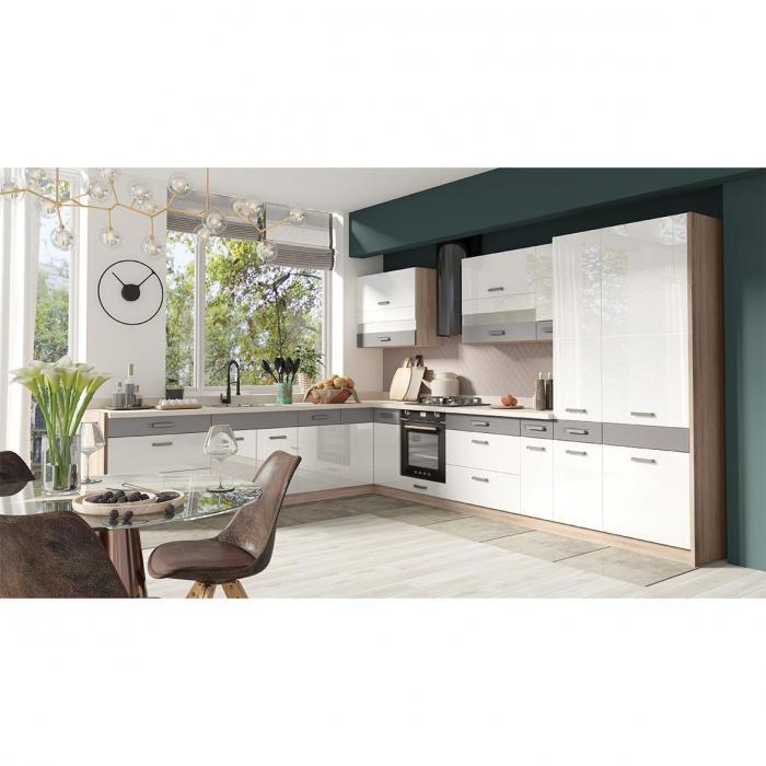 Kuchnia Global nada wnętrzu nowoczesności, ale sprawi także, że pomieszczenie będzie bardzo przytulne. W zestawie zastosowano proste lekkie bryły, dzięki czemu kuchnia nabiera eleganckiego charakteru i wydaje się też być bardziej przestronna. Do wyboru górne i dolne szafki kuchenne wykonane z wysokiej jakości trwałych materiałów, co podczas użytkowania jest bardzo ważne. Fronty kuchenne wykonane z płyty laminowanej w kolorze szary/biały połysk. Korpus kuchni wykonany jest natomiast z płyty wiórowej laminowanej w kolorze dąb sonoma. Kuchnia z pewnością fantastycznie sprawdzi się w codziennym użytkowaniu.