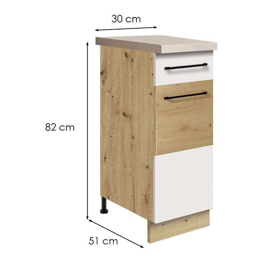 Korpus szafki utrzymany jest w eleganckim kolorze "artisan", który doskonale komponuje się z frontami. Matowe wykończenie korpusu dodaje całości elegancji, a konstrukcja oparta na płycie wiórowej laminowanej zapewnia solidność i trwałość mebla.