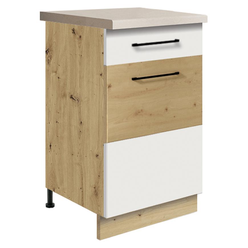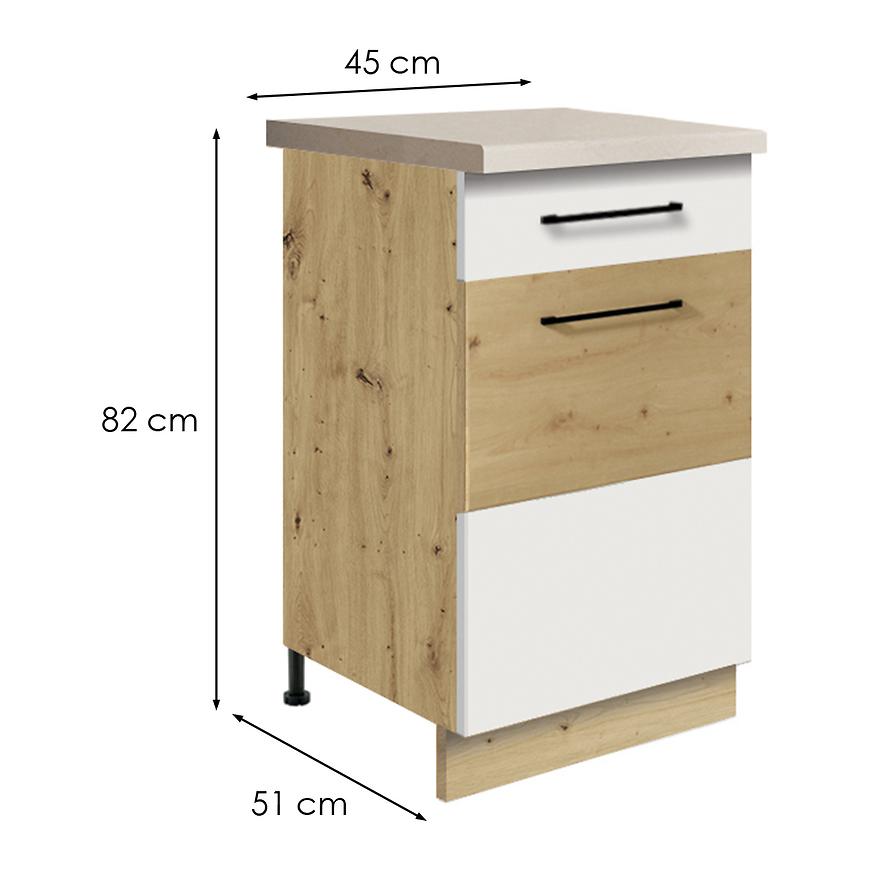 Korpus szafki utrzymany jest w eleganckim kolorze "artisan", który doskonale komponuje się z frontami. Matowe wykończenie korpusu dodaje całości elegancji, a konstrukcja oparta na płycie wiórowej laminowanej zapewnia solidność i trwałość mebla.