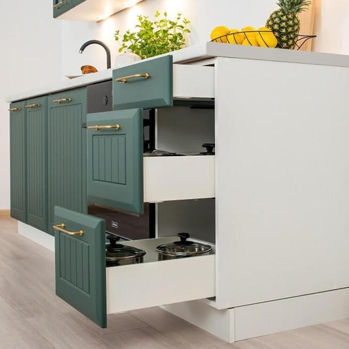 Kolekcja szafek kuchennych Irma może być nie tylko funkcjonalnym wykończeniem Twojej kuchni, ale także estetycznym dopełnieniem wnętrza. Ciemno zielone matowe fronty idealnie kontrastują z białym korpusem, tworząc przytulne, ale także pełne charakteru wnętrze. Zielony kolor frontów będzie świetnie korespondował z drewnianym blatem, a także z betonem, marmurem czy inny surowym materiałem. Dodatkowy element ozdobny szafek stanowią lamele umieszczone na frontach, dodając im przy tym uroku, jednocześnie wpisując się idealnie w nowoczesne czy klasyczne aranżacje. Różnorodne gałki i uchwyty dostepne w naszej ofercie świetnie dopełnią całość, stanowiąc ciekawy akcent. Cichy domyk, który jest ujęty w zestawie podniesie komfort codziennego użytkowania mebli.