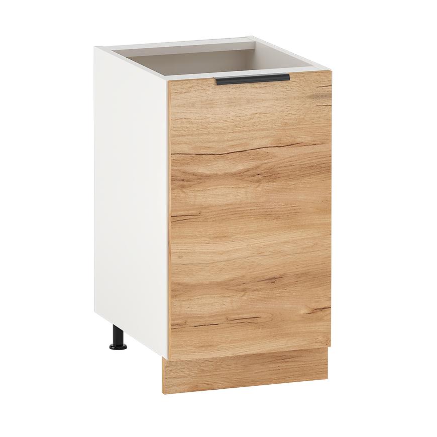 Szafka kuchenna z kolekcji Kam Set to połączenie funkcjonalności, nowoczesnego designu i solidnej konstrukcji. Kolorystyka frontów utrzymana w ciepłym odcieniu złoty dąb tworzy harmonijną przestrzeń, podczas gdy biały korpus dodaje lekkości i optycznej przestrzeni.
