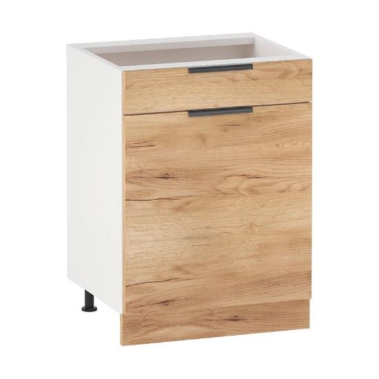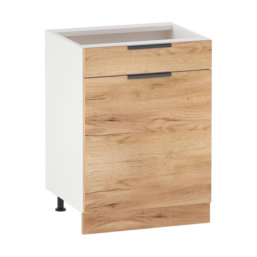 Szafka kuchenna z kolekcji Kam Set to połączenie funkcjonalności, nowoczesnego designu i solidnej konstrukcji. Kolorystyka frontów utrzymana w ciepłym odcieniu złoty dąb tworzy harmonijną przestrzeń, podczas gdy biały korpus dodaje lekkości i optycznej przestrzeni.