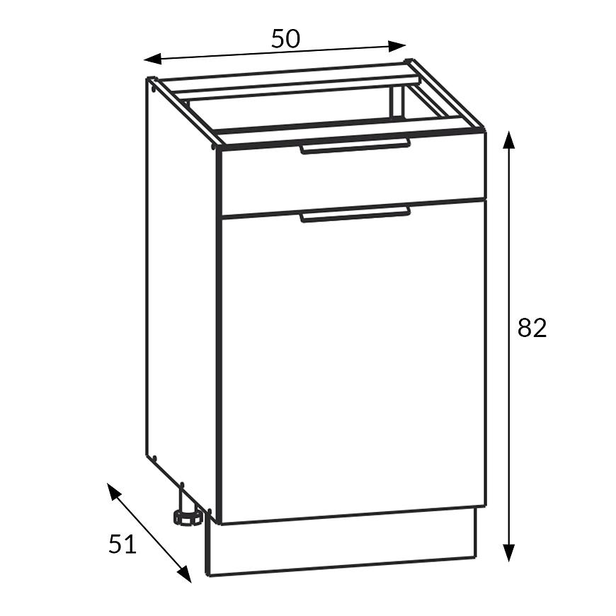Cichy domyk to praktyczna cecha, która sprawia, że korzystanie z szafki jest komfortowe i niemal bezszelestne. Nogi, będące integralną częścią konstrukcji, dodają stabilności i solidności całej szafce. Cokół w kolorze korpusu to subtelny detal, który nadaje szafce spójny wygląd, tworząc harmonijne połączenie z resztą mebla.