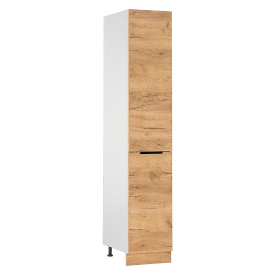 Szafka kuchenna z kolekcji Kam Set to połączenie funkcjonalności, nowoczesnego designu i solidnej konstrukcji. Kolorystyka frontów utrzymana w ciepłym odcieniu złoty dąb tworzy harmonijną przestrzeń, podczas gdy biały korpus dodaje lekkości i optycznej przestrzeni.