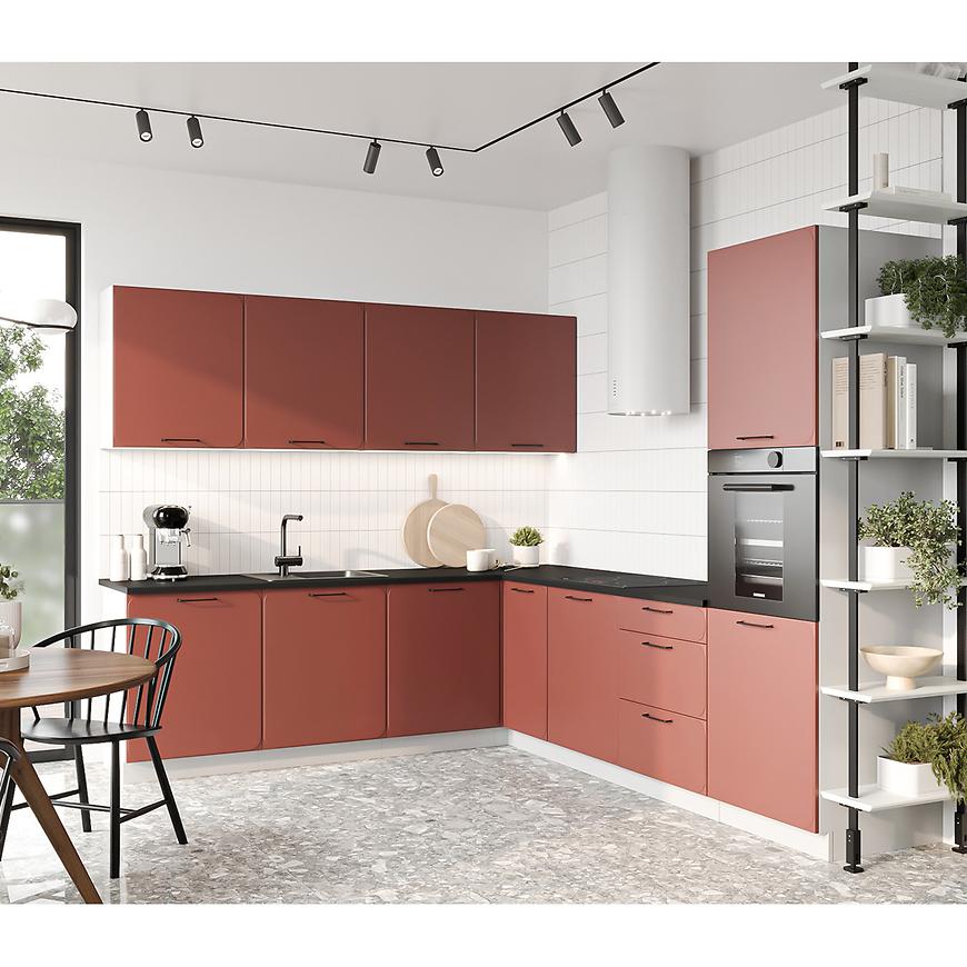 Fronty tej szafki przykuwają uwagę w ceglastym kolorze, nadając wnętrzu ciepła i charakteru. Fronty są matowe i wykonane z wytrzymałego MDF foliowanego, co gwarantuje nie tylko stylowy wygląd, ale także trwałość i łatwość w utrzymaniu czystości.