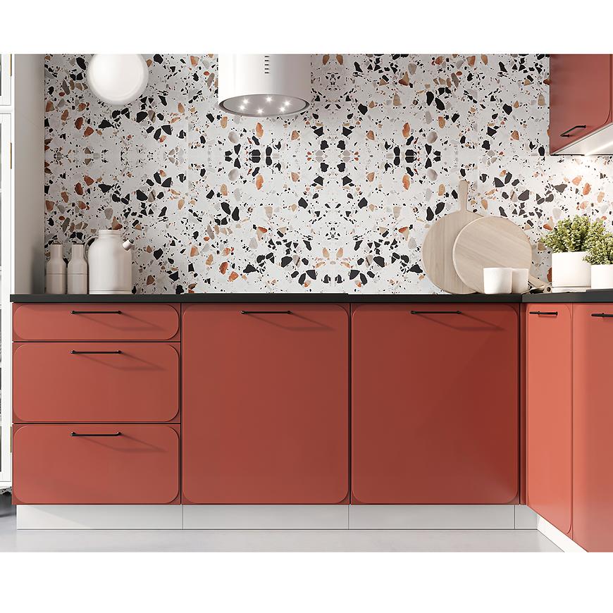 Korpus szafki KATRIN wykonana z płyty wiórowej utrzymany jest w delikatnym odcieniu popielu, co tworzy harmonijny kontrast z intensywnymi ceglastymi frontami. Cokół w kolorze korpusu nadaje elegancji i spójności całej konstrukcji.