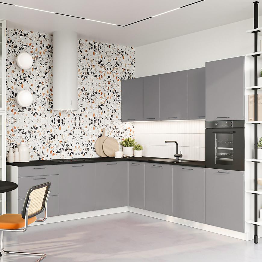 Fronty szafki w stonowanym odcieniu szarości nadają meblowi eleganckiego charakteru. Matowe wykończenie frontów podkreśla nowoczesny design, dodając mu subtelności i wyjątkowego uroku. Korpus w delikatnym odcieniu popielu stanowi idealne tło dla szarości frontów. Całość tworzy spójny i harmonijny wygląd mebla. Dodatkowo, cokół w kolorze korpusu nie tylko dodaje elegancji, ale także chroni mebel przed uszkodzeniami.