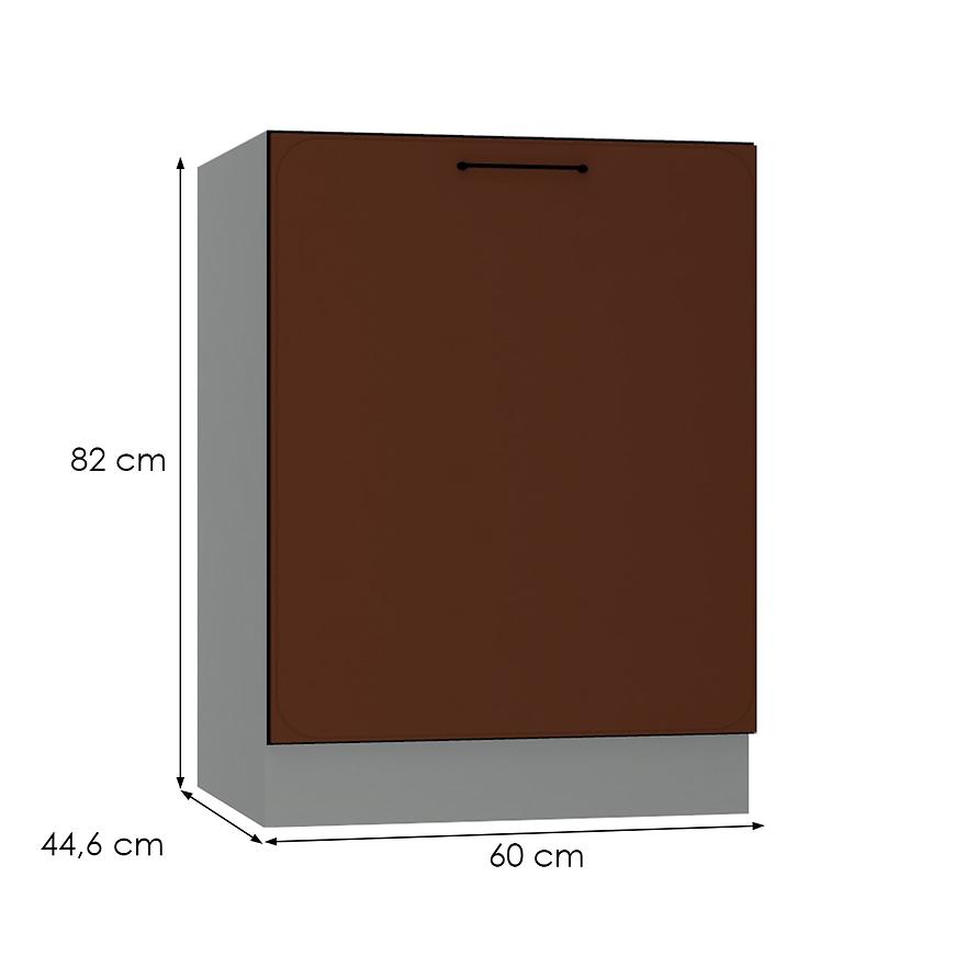 Korpus szafki KATRIN wykonana z płyty wiórowej utrzymany jest w delikatnym odcieniu popielu, co tworzy harmonijny kontrast z intensywnymi ceglastymi frontami. Cokół w kolorze korpusu nadaje elegancji i spójności całej konstrukcji.