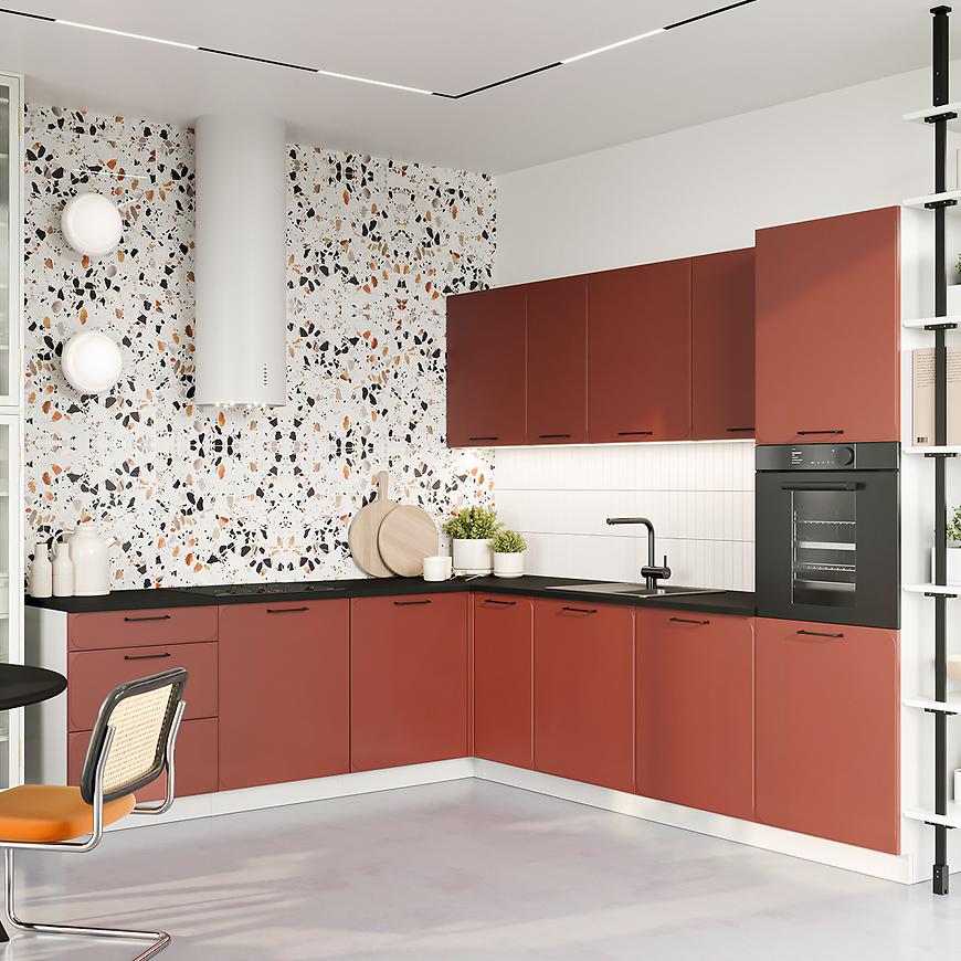 Kolor frontów w intensywnym ceglastym odcieniu nadaje szafce Katrin unikalnego charakteru. Ten odważny wybór kolorystyczny sprawia, że mebel staje się centralnym punktem w każdej kuchni. Matowe wykończenie frontów dodaje elegancji i podkreśla nowoczesny styl.