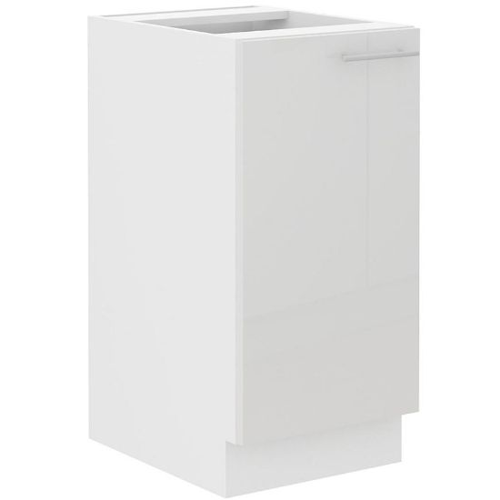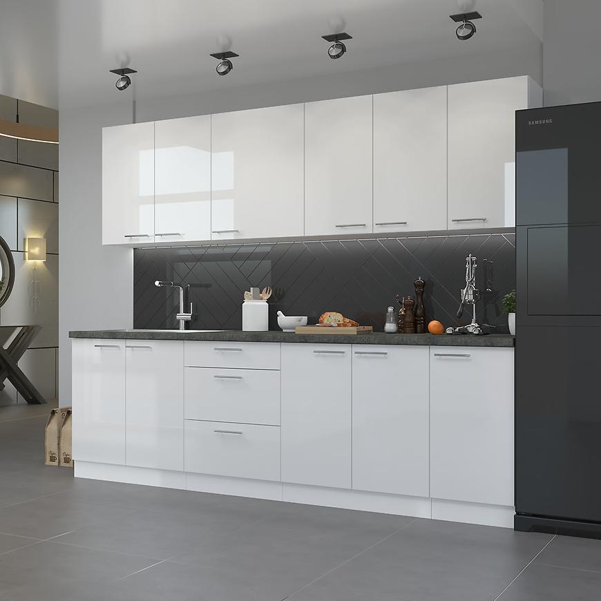 Fronty szafki, wykonane z płyty wiórowej laminowanej, prezentują się niezwykle nowocześnie dzięki efektowi połysku. To wykończenie nadaje meblowi wyjątkowego blasku, który podkreśla elegancję kuchennego otoczenia. Z kolei matowe wykończenie korpusu nadaje meblowi subtelny i stonowany wygląd, równoważąc efekt połyskliwych frontów.