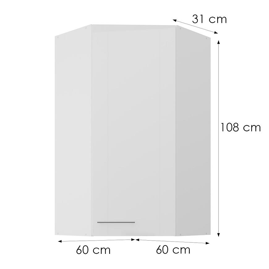 Szafka Lara 60x60 GN-108 1F (45°) wykonana jest z płyty wiórowej laminowanej w części frontowej i korpusowej, co zapewnia trwałość i odporność na codzienne użytkowanie. Wysokość 108 cm i głębokość 31 cm umożliwiają efektywne wykorzystanie narożnej przestrzeni nad blatem, a jednodrzwiowa konstrukcja zapewnia łatwy dostęp do wnętrza szafki i praktyczne przechowywanie naczyń oraz akcesoriów kuchennych.