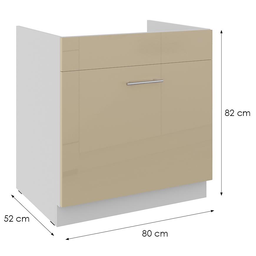 Szafka wyróżnia się cappuccino połysk frontów, białym matowym korpusem, cichym domykiem i dopasowanym cokołem. Wykonana z laminowanej płyty wiórowej, wymaga samodzielnego montażu, blat nie jest w zestawie. Szafka pod zlew 80 cm to praktyczny i elegancki element każdej kuchni.