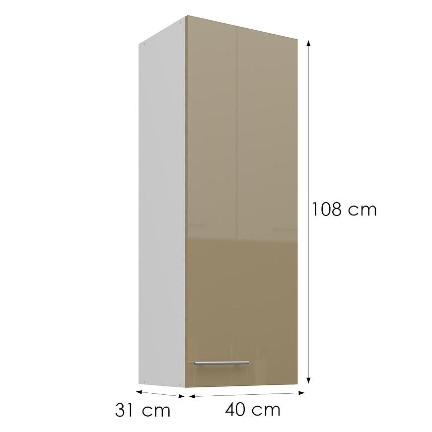 Wymiary szafki – 40 cm szerokości, 108 cm wysokości i 31 cm głębokości – pozwalają na efektywne wykorzystanie przestrzeni nad blatem roboczym, tworząc funkcjonalną i estetyczną zabudowę kuchenną.