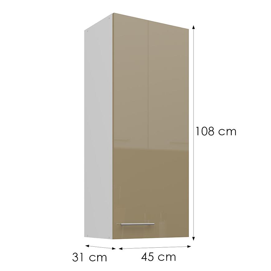 Wymiary szafki – 45 cm szerokości, 108 cm wysokości i 31 cm głębokości – pozwalają efektywnie wykorzystać przestrzeń nad blatem roboczym, tworząc funkcjonalną i estetyczną zabudowę kuchenną.