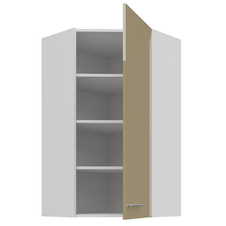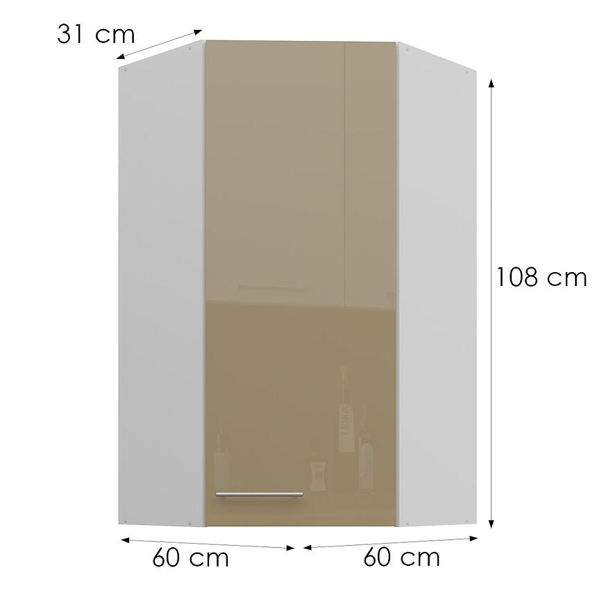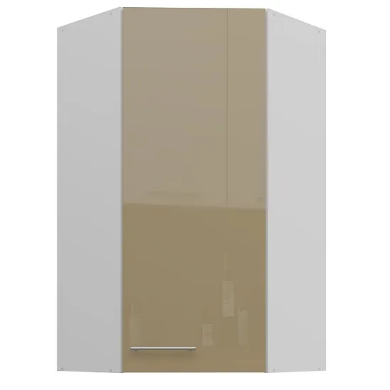 Szafka kuchenna Lara cappucino 60x60 GN-108 1F (45°) to elegancki i funkcjonalny narożny moduł górnej zabudowy kuchennej, który sprawdzi się w nowoczesnych, jasnych wnętrzach. Należy do kolekcji LARA, łączącej stylowe kolory z modnym połyskiem frontów. Narożna konstrukcja 45° i szerokość 60x60 cm pozwala na efektywne wykorzystanie przestrzeni narożnej, zapewniając wygodne przechowywanie naczyń, akcesoriów kuchennych i produktów spożywczych.