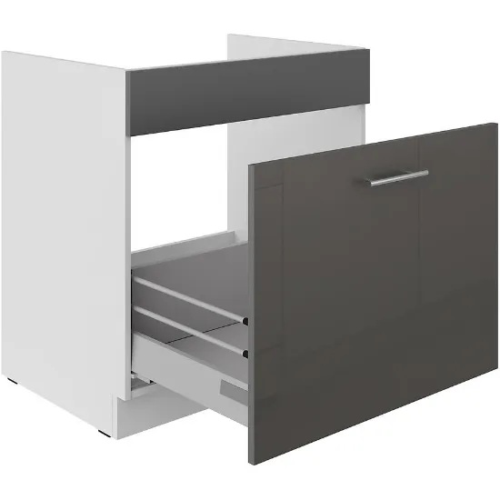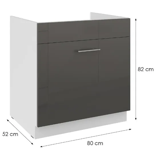 Szafka kuchenna Lara 80ZL 1S BB w eleganckim szarym połysku z białym matowym korpusem to propozycja dla osób ceniących nowoczesny design i funkcjonalność w kuchni. Szafka o wymiarach 80x52x82 cm doskonale komponuje się z innymi elementami zabudowy, tworząc spójną aranżację wnętrza.