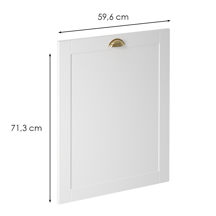 Front szafki, również w białym kolorze, jest wykończony matową powierzchnią wykonanay z płyty wiórowej laminowanej, co nadaje mu elegancji i łatwości w utrzymaniu czystości.