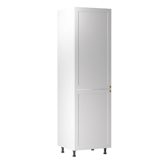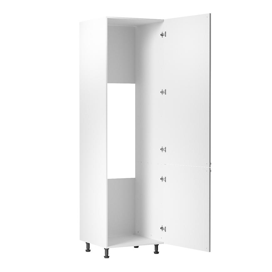 Korpus szafki, również w białym kolorze, jest wykończony matową powierzchnią, co nadaje mu elegancji i łatwości w utrzymaniu czystości. Zarówno fronty, jak i korpus wykonane są z trwałej płyty wiórowej laminowanej, co zapewnia solidność i trwałość mebla.