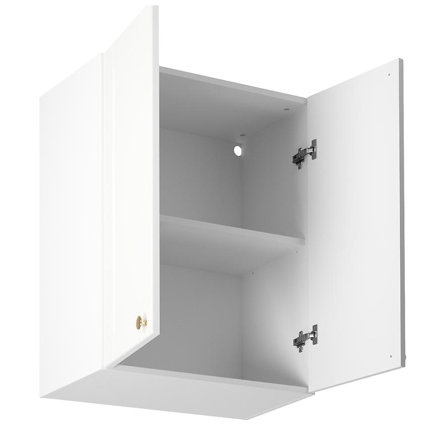 Korpus szafki, również w białym kolorze, jest wykończony matową powierzchnią, co nadaje mu elegancji i łatwości w utrzymaniu czystości. Zarówno fronty, jak i korpus wykonane są z trwałej płyty wiórowej laminowanej, co zapewnia solidność i trwałość mebla. Szafka nie posiada cichego domyku, co warto wziąć pod uwagę przy jej użytkowaniu.
